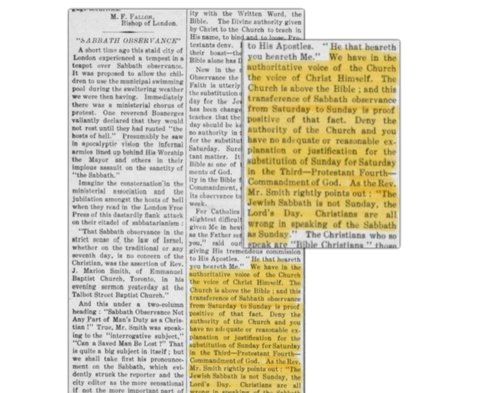 We have the authoritative voice of Christ Himself in the Church. The Church is above the Bible; and this change from Sabbath to Sunday is proof of that fact. If the authority of the Church were rejected, there would be no explanation or justification for the substitution of the Sabbath for Sunday in the third–Protestant–fourth commandment of God.”